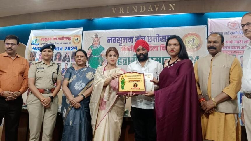 भिलाई। अदा मिसेज़ इंडिया की विजेता और आकाशवाणी की अनाउंसर दीपा मेश्राम को अंतरराष्ट्रीय महिला दिवस पर सम्मानित किया गया। नव सृजन मंच छत्तीसगढ़ की ओर से ‘महतारी सम्मान 2024’ कार्यक्रम कराया गया जिसमें दीपा मेश्राम को सम्मानित किया गया। यह कार्यक्रम 12 मार्च को वृंदावन हॉल रायपुर में आयोजित किया गया। इस कार्यक्रम में छत्तीसगढ़ की विविध क्षेत्रों में कार्य कर एक मुकाम प्राप्त करने वाली 40 महिलाओं और 12 स्वसहायता समूहों का रुपया, माला, मोहरी से सम्मान किया गया।