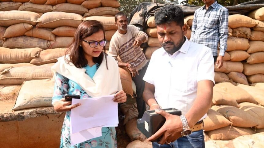 दुर्ग। जिले के नव पदस्थ कलेक्टर सुश्री ऋचा प्रकाश चौधरी ने आज धान उपार्जन केंद्र सिरसा का औचक निरीक्षण किया। उन्होंने यहाँ पर खरीदी की गई धान, धान की उठाव, स्टैग व्यवस्था, नमी मापी मशीन, बरदाना आदि की जानकारी ली। कलेक्टर ने मौके पर खरीदी की गई धान की आद्रता की माप नमी मापी मशीन से कराई।
