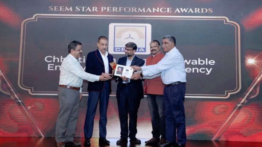 रायपुर। छत्तीसगढ़ राज्य अक्षय ऊर्जा विकास अभिकरण (क्रेडा) को नई दिल्ली में आयोजित समारोह में ऊर्जा संरक्षण के क्षेत्र में राष्ट्रीय स्तर पर सर्वश्रेष्ठ प्रदर्शन के लिए स्टार परफॉर्मेंस अवार्ड से पुरस्कृत किया गया। सोसाईटी ऑफ एनर्जी इजीनियर्स एण्ड मैनेजर्स – सीम द्वारा 21 सितम्बर को आयोजित 8वें नेशनल एनर्जी मैनेजमेंट अवार्ड समारोह में यह सम्मान दिया गया। आलोक कटियार, मुख्य कार्यपालन अधिकारी, छत्तीसगढ़ राज्य अक्षय ऊर्जा विकास अभिकरण (क्रेडा) द्वारा उक्त पुरस्कार को डॉ. अशोक कुमार, उप महानिदेशक, ऊर्जा दक्षता ब्यूरों, (बी.ई.ई.) भारत सरकार के उपस्थिति में प्राप्त किया गया। इस समारोह में क्रेडा की ओर से संजीव जैन, मुख्य अभियंता एवं राजीव ज्ञानी, अधीक्षण अभियंता भी उपस्थित रहें। मुख्यमंत्री भूपेश बघेल ने इस पुरस्कार के लिए क्रेडा की टीम और प्रदेशवासियों को बधाई दी है।