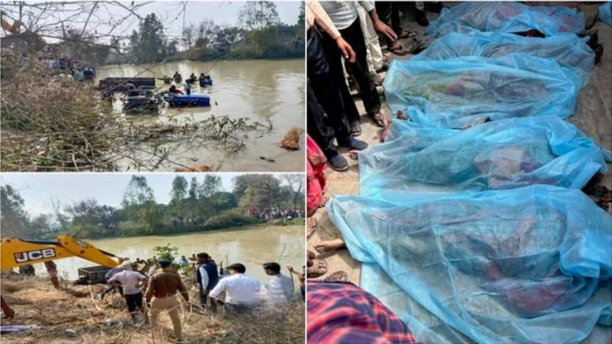 कासगंज (एजेंसी)। उत्तर प्रदेश के कासगंज जिले में बड़ा सड़क हादसा हुआ है। पटियाली-दरियावगंज मार्ग पर सुबह करीब 10 बजे श्रद्धालुओं से भरी एक ट्रैक्टर ट्रॉली अनियंत्रित होकर तालाब में जा गिरी। तालाब में जाकर ट्रैक्टर ट्रॉली पलट गई। जिसमें ज्यादातर श्रद्धालु दब गए। इस हादसे में 20 से अधिक लोगों की मौत अब तक हो चुकी है।
