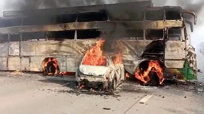 आज सुबह तड़के थाना महावन क्षेत्र के अंतर्गत माइल स्टोन 117 पर अचानक से एक बस और कार में भीषण आग लग गई। बस की सवारियों ने बस से कूदकर अपनी जान बचाई। बताया गया है कार सवार अंदर ही फंस गए। कार में चार लोगों की जिंदा जलकर मौत हो गई।