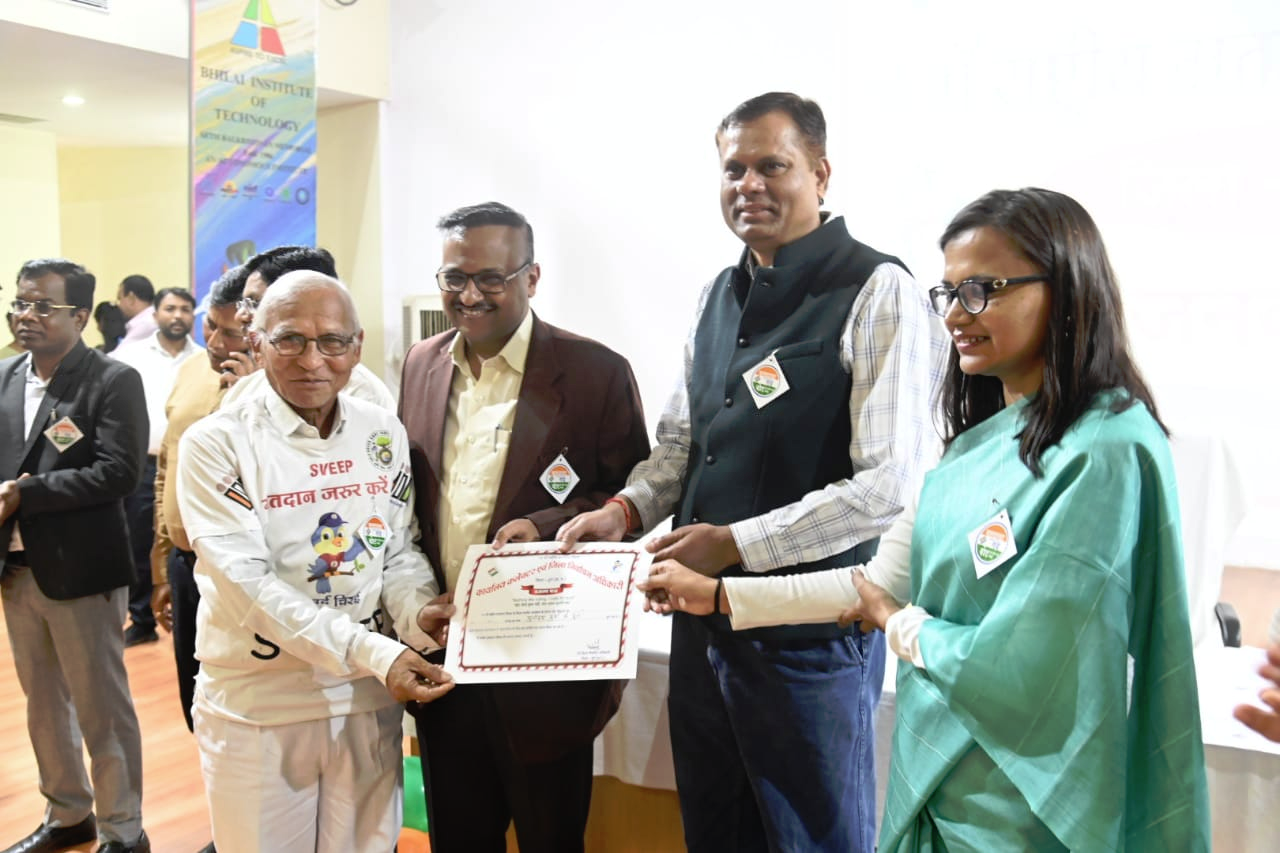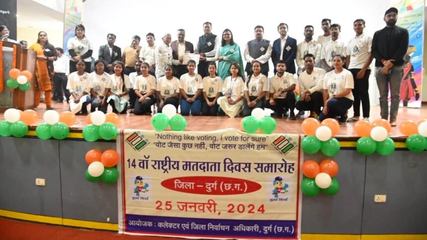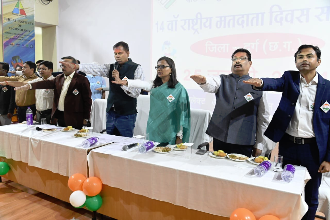 दुर्ग। भारत निर्वाचन आयोग तथा मुख्य निर्वाचन पदाधिकारी छत्तीसगढ़ रायपुर के निर्देशानुसार 14वें राष्ट्रीय मतदाता दिवस के अवसर पर जिला स्तरीय कार्यक्रम का आयोजन बी.आई.टी. दुर्ग के ऑडिटोरियम में किया गया। इस अवसर पर कमिश्नर सत्यनारायण राठौर द्वारा मतदाताओं को मतदाता दिवस की शपथ दिलाई गई। नवीन मतदाताओं ने सभी अधिकारियों को प्रतीकात्मक रूप से बैच लगाकर सम्मानित किया गया।