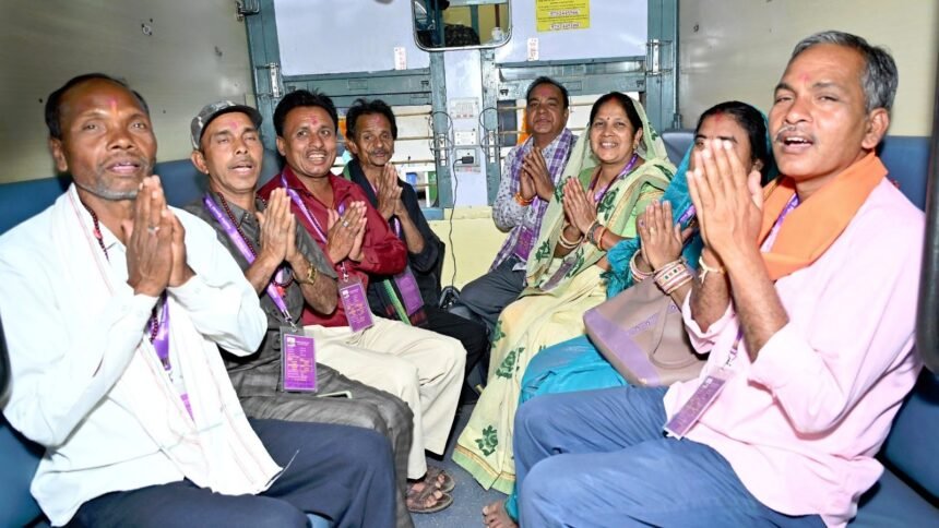 रायपुर। माता कौशल्या के धाम छत्तीसगढ़ के गांव-गांव में श्रीराम लला के दर्शन को लेकर उत्साह का माहौल है। इस उत्साह और उमंग के साथ राजधानी रायपुर से आज बसंत पंचमी के दिन रायपुर संभाग के 1344 राम भक्त आस्था स्पेशल ट्रेन से अयोध्या धाम रामलला के दर्शन के लिए रवाना हुए। इस दौरान जय श्रीराम के जयकारे के साथ पूरा माहौल राममय हो गया जब मुख्यमंत्री विष्णु देव साय ने रेल्वे स्टेशन से अयोध्या स्पेशल गाड़ी को हरी झंडी दिखा कर रवाना किया। छत्तीसगढ़ के राम भक्तों ने मुख्यमंत्री साय को धन्यवाद देते हुए कहा कि कभी सोचा नहीं था भांचा राम की नगरी अयोध्यापुरी जाना होगा।