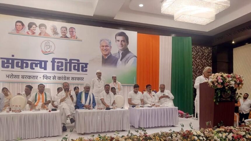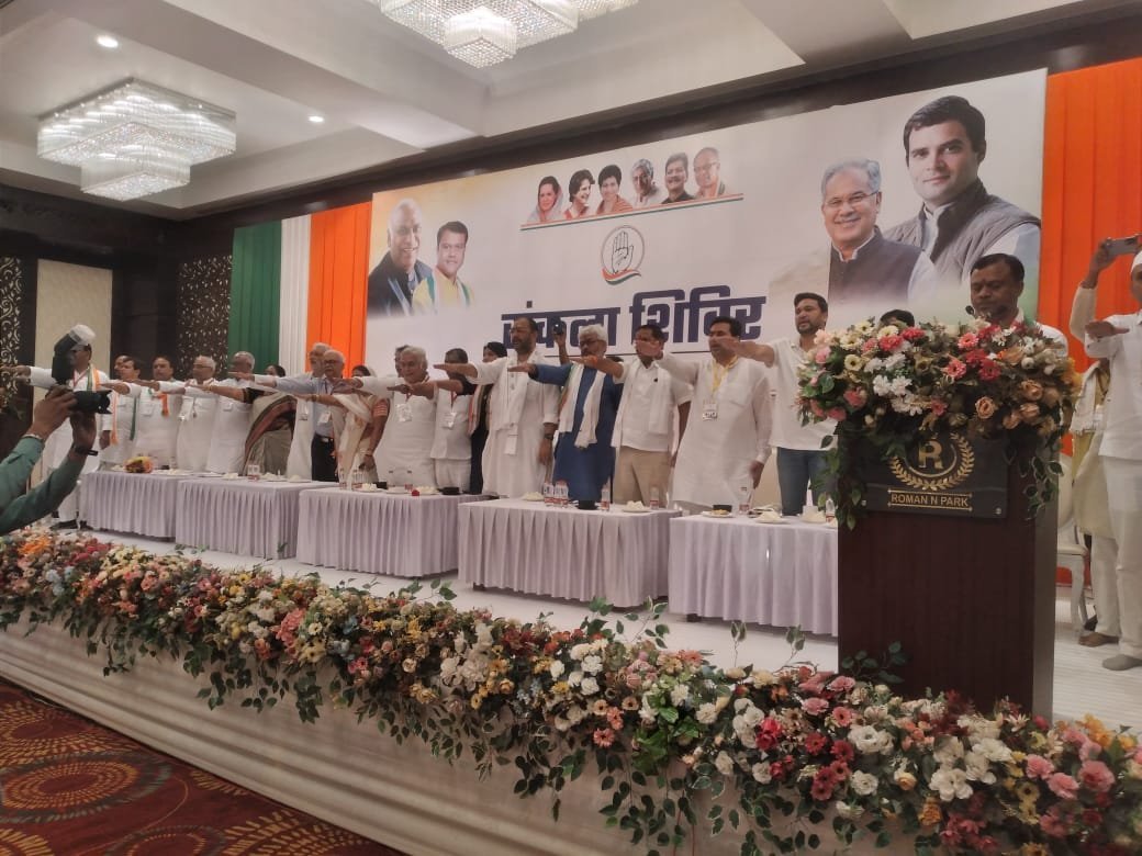 दुर्ग। दुर्ग के रोमन पार्क में कांग्रेस की विधानसभा स्तरीय संकल्प शिविर का आयोजन किया गया। जिसमे छत्तीसगढ़ प्रदेश कांग्रेस कमेटी के अध्यक्ष दीपक बैज सहित कांग्रेस के दिग्गज नेता शरीक हुए। संकल्प शिविर में आगामी विधानसभा चुनाव हेतू बूथ मैनेजमेंट एवं भूपेश बघेल सरकार की योजनाओं की जानकारी दी गई। प्रदेश अध्यक्ष दीपक बैज ने अपने भाषण से कांग्रेसी कार्यकर्ताओं में जोश भरा वही मुख्यमंत्री के सलाहकार विनोद वर्मा एवं राजेश तिवारी ने संकल्प शिविर में आए हजारों कांग्रेस के पदाधिकारियों को संबोधित किया। संकल्प शिविर में कांग्रेसी कार्यकर्ताओं ने बढ़ चढ़ कर हिस्सा लिया एवं हजारों के तादाद में कार्यक्रम में उपस्थित हुए। इसी बीच अरूण वोरा के समर्थन में अरूण वोरा जिंदाबाद के नारे भी लगातार लगते रहे एवं बड़ी युवाओं की फौज उनके साथ चलती दिखाई दी।