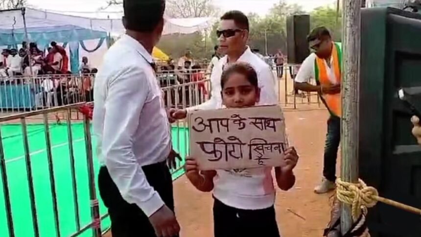 रायपुर। मुझे सीएम के साथ फोटो खिंचवाना है। यही मांग लेकर हाथों में तख्ती थामे मासूम बच्ची छत्तीसगढ़ के मुख्यमंत्री विष्णुदेव साय की चुनावी सभा में पहुंची। फिर क्या था सभा में मौजूद सभी लोगों की नजर उस प्यारी से बच्ची पर टिकी की टिकी रह गई। सीएम साय भी अपने आप को नहीं रोक पाये। बच्ची की इस मांग को पूरा करते हुए उन्होंने अपने पास बुलाया और प्यार से दुलारते हुए उसे बुके देकर सम्मानित किया।