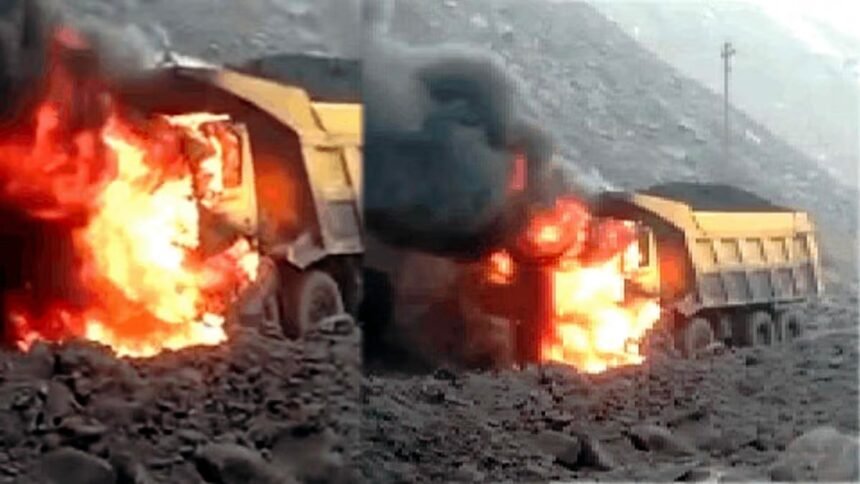 सुरक्षा पखवाड़ा की खुली पोल: नहीं रुक रहे हादसे, कोयला लोड ट्रक में लगी भीषण आग, ड्राइवर ने कूद कर बचाई जान