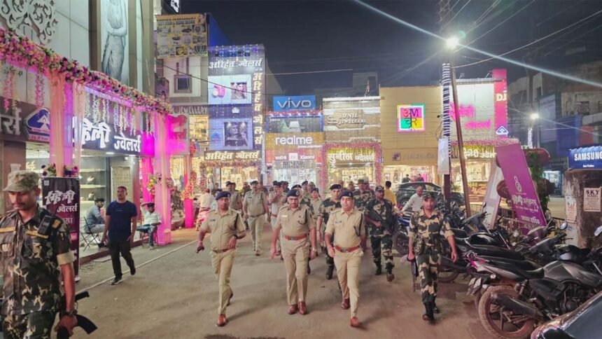 भिलाई। छत्तीसगढ़ में विधानसभा चुनाव व त्योहारी भीड़ के बीच दुर्ग एसपी रामगोपाल गर्ग द्वारा सुपेला व दुर्ग के बाजारों का भ्रमण किया गया। इस दौरान दुर्ग पुलिस की टीम के साथ केंद्रीय सशस्त्र बल के जवान भी चले। 300 से अधिक केंद्रीय सशस्त्र बल व पुलिस टीम ने पैदल मार्च कर शांति व्यवस्था व लोगों को सुरक्षित माहौल का एहसास कराने किया गया।