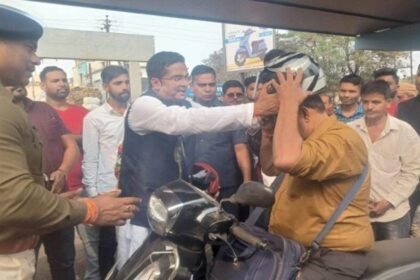Bhilai : विधायक रिकेश सेन ने सड़क पर बाइक सवारों को पहनाया हेलमेट, लोगों से की यह अपील