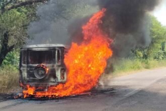 बालोद। छत्तीसगढ़ के बालोद जिले में मंगलवार सुबह बीच सड़क पर वाहन में भयंकर आग लग गई। वाहन में सवार लोग किसी तरह से जान बचाकर निकले। दरअसल सभी एक…