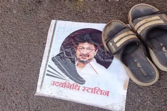 सनातन धर्म के खिलाफ बयानबाजी, उदयनिधि स्टलिन के पोस्टर पर चप्पल रखकर जता रहे विरोध