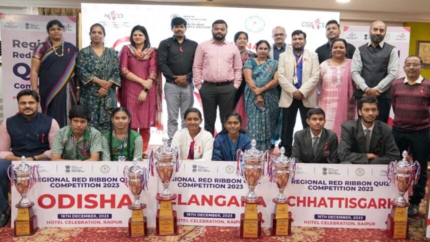 रायपुर। राष्ट्रीय एड्स नियंत्रण संगठन स्वास्थ एवम परिवार कल्याण विभाग नई दिल्ली के मार्गदर्शन में छत्तीसगढ़ राज्य एड्स नियंत्रण समिति द्वारा रीजनल रेड रिबन क्विज प्रतियोगिता का आयोजन किया गया। जिसमे बिहार, झारखंड, ओडिशा, तेलंगाना, छत्तीसगढ़ एवम अंडमान निकोबार से विद्यालयों के प्रतिभागी अपने नोडल शिक्षको के साथ सम्मिलित हुए। कार्यक्रम में राष्ट्रीय एड्स नियंत्रण संगठन से सूची गौतम सलाहकार आईईसी एवम एमएस सम्मिलीत हुए। परियोजना संचालक जय प्रकाश मौर्य परियोजना संचालक के सफल मार्गदर्शन एवं अतिरिक्त परियोजना संचालक डॉ जीजे राव के कुशल नेतृत्व में कार्यक्रम आयोजित किया गया। क्विज प्रतियोगिता में तेलंगाना को प्रथम स्थान, छत्तीसगढ़ को द्वितीय स्थान, ओडिशा को तीसरा स्थान मिला।