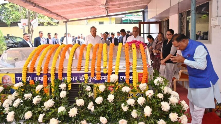 रायपुर। छत्तीसगढ़ के मुख्यमंत्री विष्णुदेव साय ने पूर्व सीएम भूपेश बघेल के पिता नंद कुमार बघेल के निधन पर गहरा शोक व्यक्त किया है। वे मंगलवार को राजधानी स्थिति पाटन सदन पहुंचे जहां पूर्व सीएम बघेल के पिता का पार्थिव शरीर रखा हुआ है। सीएम साय ने पुष्प अर्पित कर उन्हें श्रद्धांजलि दी। इस दौरान विधानसभा अध्यक्ष डॉ रमन सिंह, डिप्टी सीएम अरुण साव, प्रदेश भाजपा अध्यक्ष किरण सिंह देव भी मौजूद रहे।