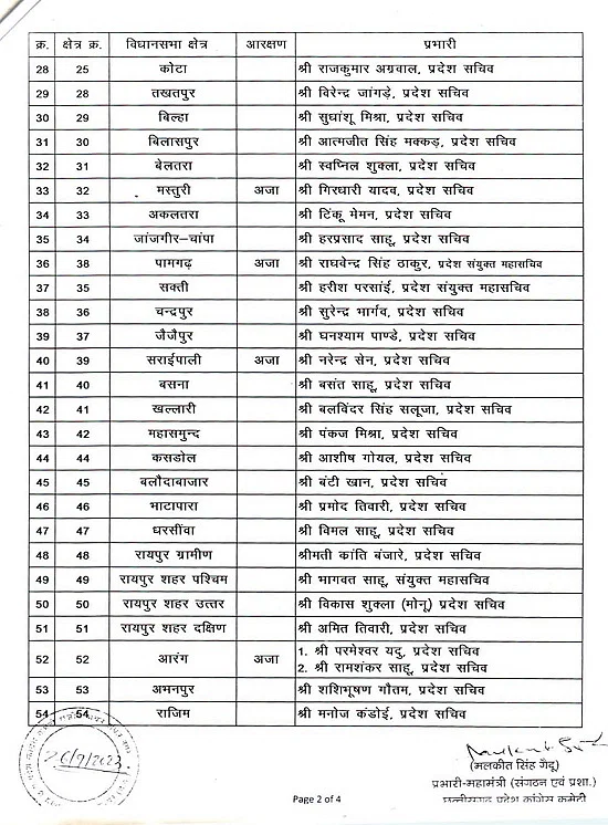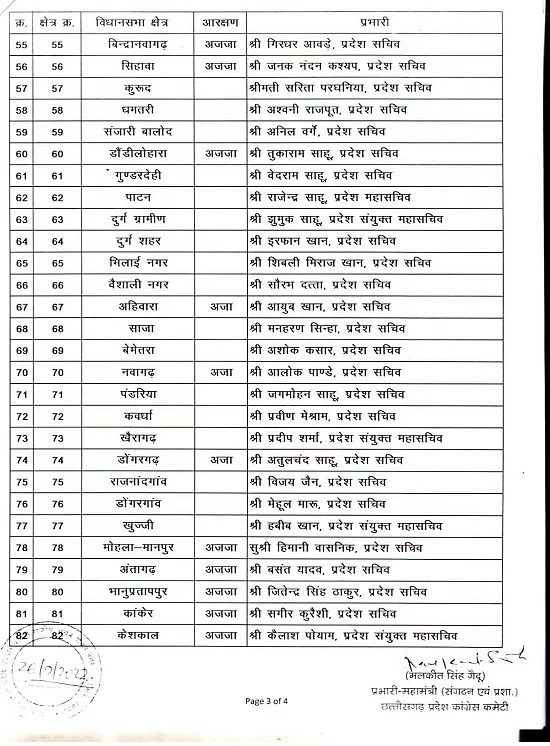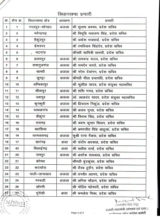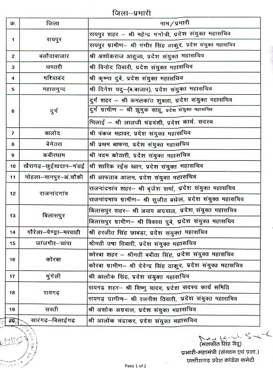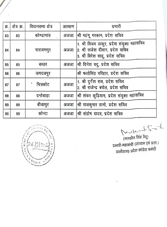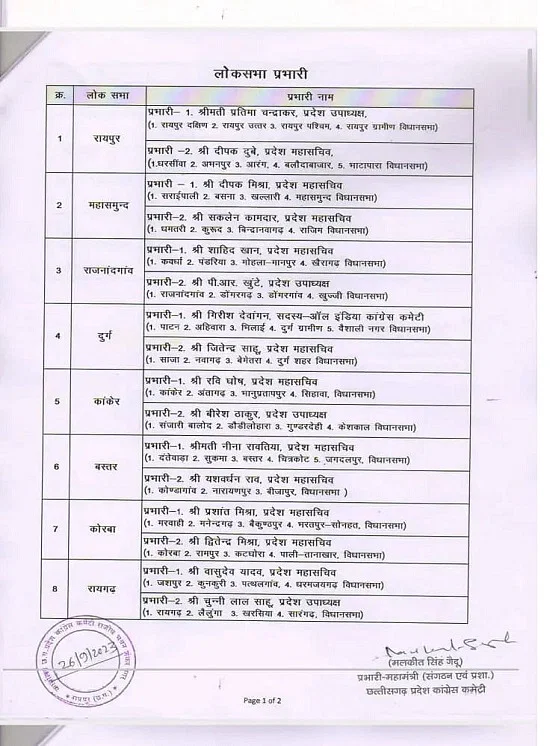 रायपुर। छत्तीसगढ़ में आगामी विधानसभा चुनाव को लेकर कांग्रेस पार्टी अपनी तैयारियां कर रही है। प्रत्याशियों की घोषणा के पहले चुनाव संचालन के लिए नेताओं को जिम्मेदारी दी जा रही है। इसी कड़ी में कांग्रेस पार्टी ने विधानसभावार, लोकसभावार और जिलावार प्रभारियों की नियुक्ति की है। इसमें 11 लोकसभा, के लिए 22 प्रभारियों की नियुक्ति की गई है। 33 जिलों के लिए 40 प्रभारी बनाए गए हैं। वहीं 90 विधानसभा के लिए 90 प्रभारी नियुक्त किए गए हैं।