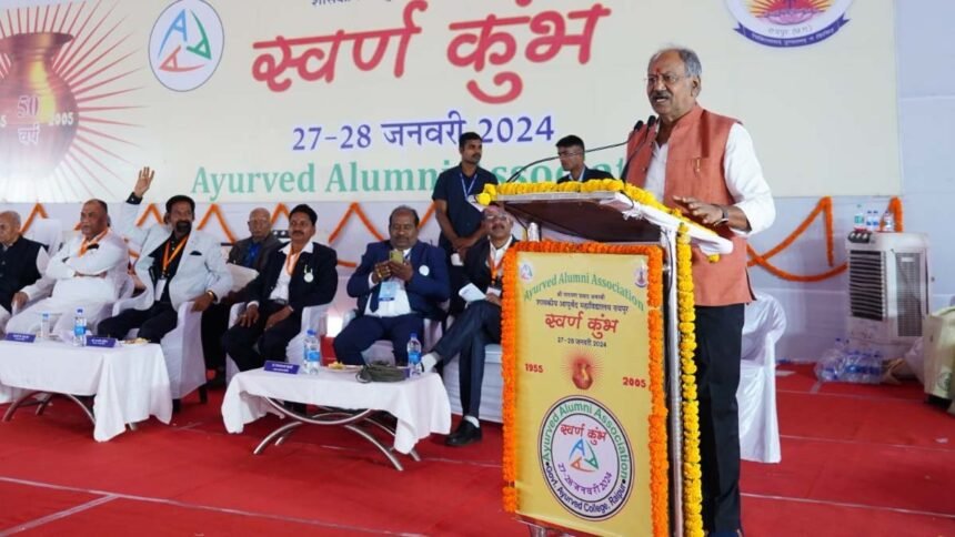 शिक्षा मंत्री बृजमोहन अग्रवाल ने शनिवार को श्री नारायण प्रसाद अवस्थी शासकीय आयुर्वेद महाविद्यालय में 2 दिवसीय आयुर्वेद एलुमनी मीट ‘‘स्वर्ण कुंभ का शुभारंभ करते हुए प्रदेश का पहला आयुर्वेद विश्वविद्यालय राजधानी रायपुर में खोलने की घोषणा की। इस मौके पर उन्होंने कॉलेज से पढ़कर निकले और देश-विदेश में सेवाएं दे रहे, ऐसे पुराने डॉक्टर्स को सम्मानित भी किया। शिक्षा मंत्री अग्रवाल ने कहा कि प्रधानमंत्री नरेंद्र मोदी ने एक बार फिर आयुर्वेद और आयुष को बढ़ावा दिया है, जिसके बाद आज पूरी दुनिया में आयुर्वेद को अलग पहचान मिली है। कोरोना काल में आयुर्वेदिक काढ़े और दवाइयों ने लाखों लोगों की जान बचाई। लोगों में आयुर्वेद के प्रति जागरूकता लाने का भी सुझाव अग्रवाल ने दिया। उन्होंने कहा कि आयुर्वेद हमारे जीवन पद्धति का एक अंग है। हमारे घरों का रसोई घर अपने आप में एक आयुर्वेदिक औषधि केंद्र है। एक जानकर व्यक्ति इनका सही प्रयोग करके निरोगी काया पा सकता है। आयुर्वेद आदिकाल से है। जब लंका में लक्ष्मणजी मूर्छित हुए थे तब भी वैद्यराज सुषेण ने आयुर्वेद के जरिए उनकी जान बचाई थी, उस वक्त एलोपैथ का नामोनिशान नहीं था। लेकिन अंग्रेजों के समय से भारतीय चिकित्सा प्रणाली को हाशिए पर ला दिया गया था।