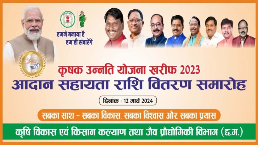 गौरतलब है कि प्रधानमंत्री नरेन्द्र मोदी ने छत्तीसगढ़ के किसानों से 3100 रुपए क्विंटल की दर से धान खरीदी की गारंटी दी थी। इस गारंटी को पूरा करने के लिए छत्तीसगढ़ सरकार की कृषक उन्नति योजना का प्रदेशव्यापी शुरूआत 12 मार्च मंगलवार को होने जा रहा है। इस योजना के तहत किसानों को आदान सहायता राशि का अंतरण उनके बैंक खातों में करने के लिए राज्य के सभी जिला मुख्यालयों सहित विकासखण्ड मुख्यालयों में भी कार्यक्रम आयोजित होंगे।