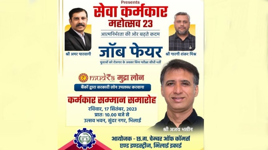 भिलाई। छत्तीसगढ़ चेम्बर ऑफ कॉमर्स एंड इंडस्ट्रीज भिलाई इकाई नित नए आयोजन करती है। इसी कड़ी में इस बार विश्कर्मा जयंती व माननीय प्रधानमंत्री जी जन्मदिवस को यादगार बनाने एक विशेष आयोजन किया जा रहा है। भिलाई चेम्बर द्वारा रविवार 17 सितंबर को कर्मकार सेवा सम्मान समारोह के अंतर्गत रोजगार मेला(जॉब फेयर) व कर्मकार सम्मान समारोह का आयोजन किया जा रहा है।