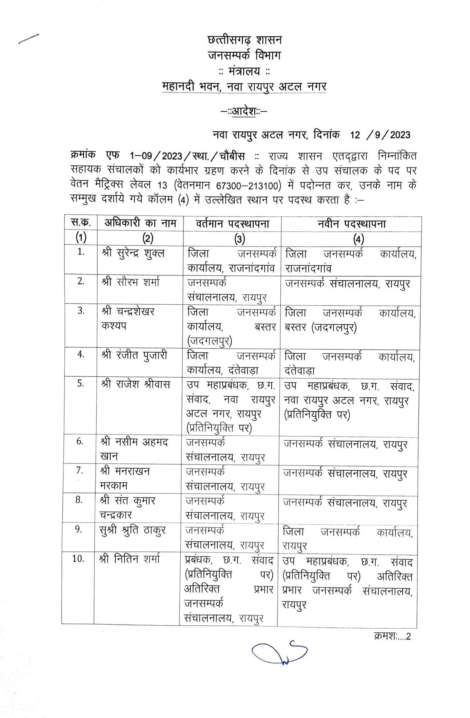 रायपुर। छत्तीसगढ़ सरकार ने जनसंपर्क विभाग में कार्यरत 14 सहायक संचालकों को प्रमोट कर उप संचालक बना दिया है। उक्त सहायक संचालकों को कार्यभार ग्रहण करने के बाद उप संचालक के पद पर वेतन मैट्रिक्स लेवल 13 में पदोन्नत कर नई पोस्टिंग भी दे दी गई है। इस संबंध में छत्तीसगढ़ जनसंपर्क विभाग द्वारा आदेश जारी कर दिया गया है।
