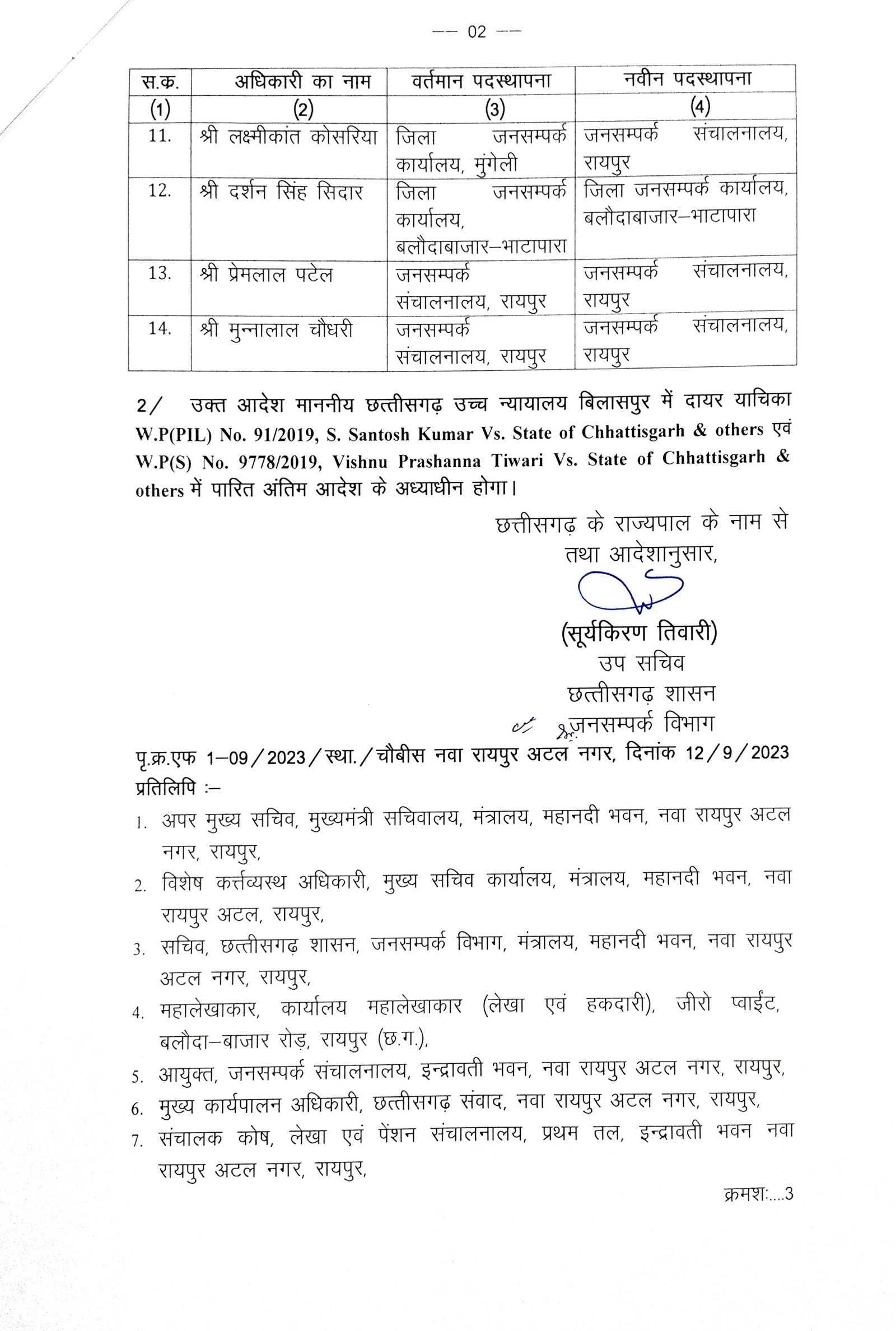 प्रमोशन पाने वाले अफसरों में रायपुर जिले से सौरभ शर्मा, राजेश श्रीवास, नसीम अहमद, मनराखन मरकाम, संत कुमार चंद्राकर, श्रुति ठाकुर, प्रेमलाल पटेल व मुन्ना लाल चौधरी सहित रायपुर संवाद में कार्यरत नितिन शर्मा शामिल हैं। इसी प्रकार बस्तर जिले से चंद्रशेखर कश्यप, दंतेवाड़ा से रंजीत पुजारी, मुंगेली जिले से लक्ष्मीकांत कोरिया, बलौदा बाजार से दर्शन सिंह सिदार व राजनांदगांव जिले से सुरेंद्र शुक्ला शामिल हैं।