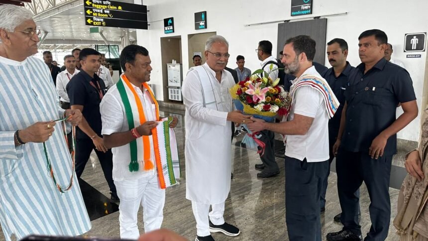 रायपुर। कांग्रेस सांसद राहुल गांधी शनिवार को राजधानी रायपुर पहुंचे। मुख्यमंत्री भूपेश बघेल ने सांसद राहुल गांधी का राजधानी रायपुर के स्वामी विवेकानंद विमानतल पर पहुंचने पर पुष्पगुच्छ से आत्मीय स्वागत किया । यहां से मुख्यमंत्री भूपेश बघेल सांसद राहुल गांधी के साथ विवेकानंद विमानतल से मेला ग्राउण्ड, कार्यक्रम स्थल पहुंचे।