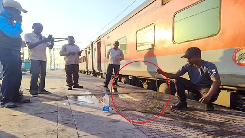 कोरबा। छत्तीसगढ़ के कोरबा रेलवे स्टेशन में अति दुर्लभ प्रजाति का ग्रीन वाईन स्नैक पहुंच गया। यह दुर्लभ सांप कर्नाटक के यशवंतपुर से ट्रेवल कर कोरबा रेलवे स्टेशन पहुंच गया। रविवार सुबह जब यशवंतपुर-कोरबा एक्सप्रेस कोरबा रेलवे स्टेशन पहुंची तो इस सांप को देखकर यात्रियों में हड़कंप मच गया। सर्पमित्र राजू बर्मन ने सांप का रेस्क्यु किया तब जाकर यात्रियों के साथ ही रेल प्रबंधन ने राहत की सांस ली।