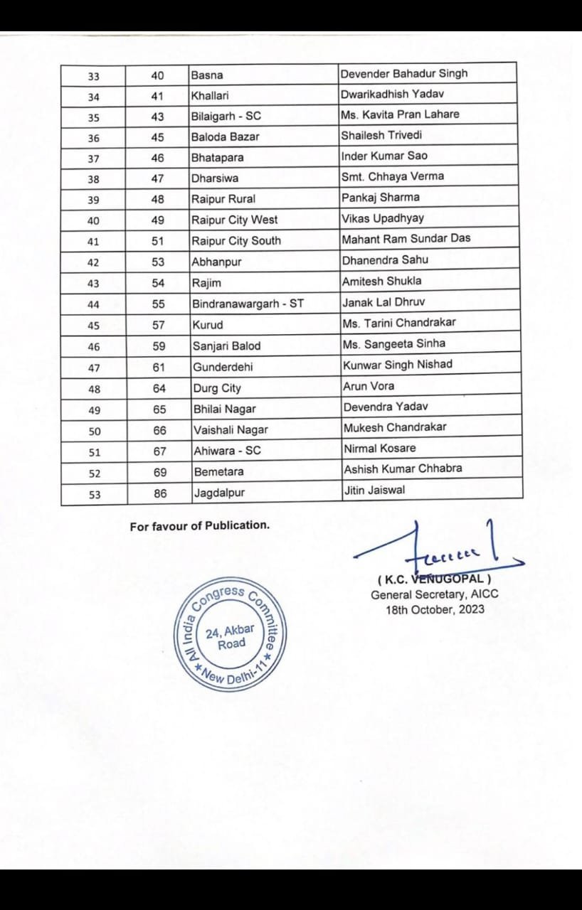 भिलाई। छत्तीसगढ़ विधानसभा चुनाव के लिए कांग्रेस आलकमान ने दूसरी सूची जारी कर दी है। दुर्ग जिले की शेष चार विधानसभा सीटों पर भी प्रत्याशियों की घोषणा कर दी गई है। भिलाई नगर विधानसभा से देवेन्द्र यादव कांग्रेस के प्रत्याशी बनाए गए हैं और वैशाली नगर विधानसभा से मुकेश चंद्राकर चुनाव लड़ेंगे। इसके अलावा कांग्रेस ने पहले चरण के तहत होने वाले 20 सीटों में एक सीट पर बचे उम्मीदवार की घोषणा कर दी है। कांग्रेस ने जगदलपुर से जतिन जससवाल को प्रत्याशी बनाया है। कांग्रेस की दूसरी सूची में कुल 53 प्रत्याशियों के नाम हैं।